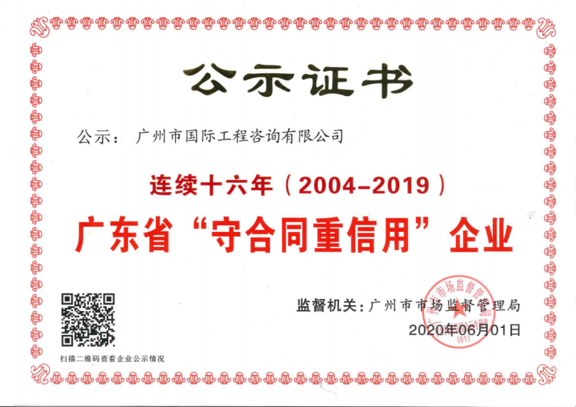 近日,廣州市國際工程咨詢有限公司順利通過廣東省市場監督管理局與廣州市市場監督管理局評審,榮獲“廣東省守合同重信用企業”稱號,這是自2004年以來,我司連續16年獲頒此殊榮,這也是我司多年守法經營,深入推動誠信建設、堅持誠信履約所取得的重要成果。
