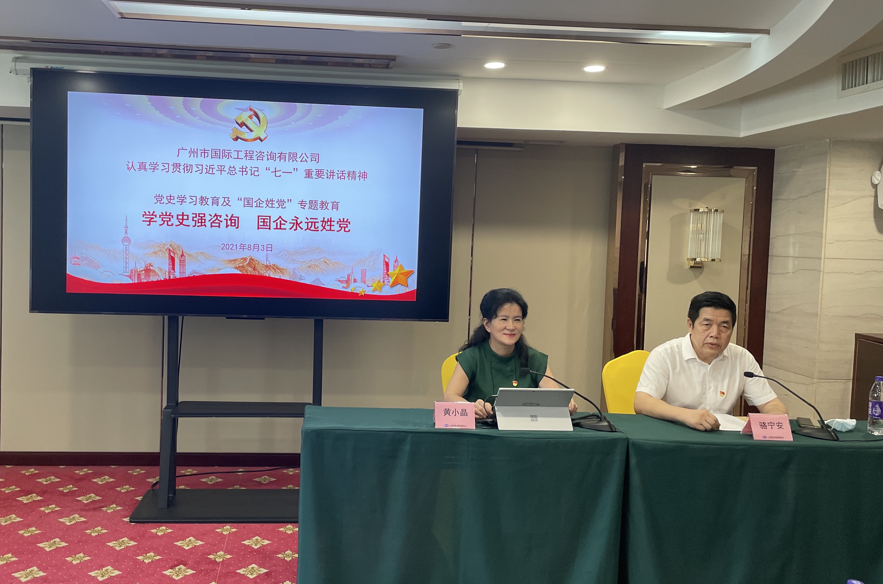根據公司黨委黨史學習教育及開展“國企姓黨”專題教育工作安排,結合認真學習貫徹習近平總書記在慶祝中國共產黨成立100周年大會上重要講話精神工作要求,廣州市國際工程咨詢有限公司黨委迅速掀起學習宣傳貫徹熱潮,推動學習培訓全覆蓋,于8月3日邀請了市委黨史學習教育領導小組成員、市委講師團成員、中共廣州市委黨史文獻研究室(市人民政府地方志辦公室)黃小晶主任作《學黨史強咨詢 國企永遠姓黨》專題宣講。